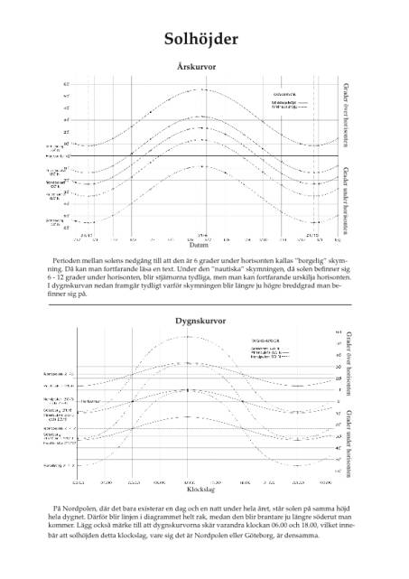 Exempel för Göteborg den 21/6: Nordpolens solhöjd är då 23,4 grader över horisonten. Middagshöjden för Göteborg är 23,4 + 32° =55,4 grader över horisonten. Midnattshöjden är 23,4 – 32° = 8.6 grader under horisonten.